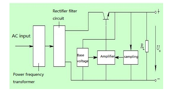 工频交流电经过变压器降压、整流、滤波后变成稳定的直流电。该图的其余部分是用于电压调节和稳定的控制部分。电源接入负载后,通过采样电路得到输出电压,并将输出电压与参考电压进行比较。如果输出电压小于参考电压,误差值经放大电路放大后送到稳压器的输入端。输出电压由稳压器调整,直到等于参考值;如果输出电压大于参考电压,则通过稳压器降低输出。