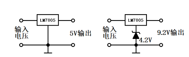 如果是输出电压固定的三端线性稳压电源,可以将相应稳压值的稳压管串联到地脚以此来提高电压。如下所示: